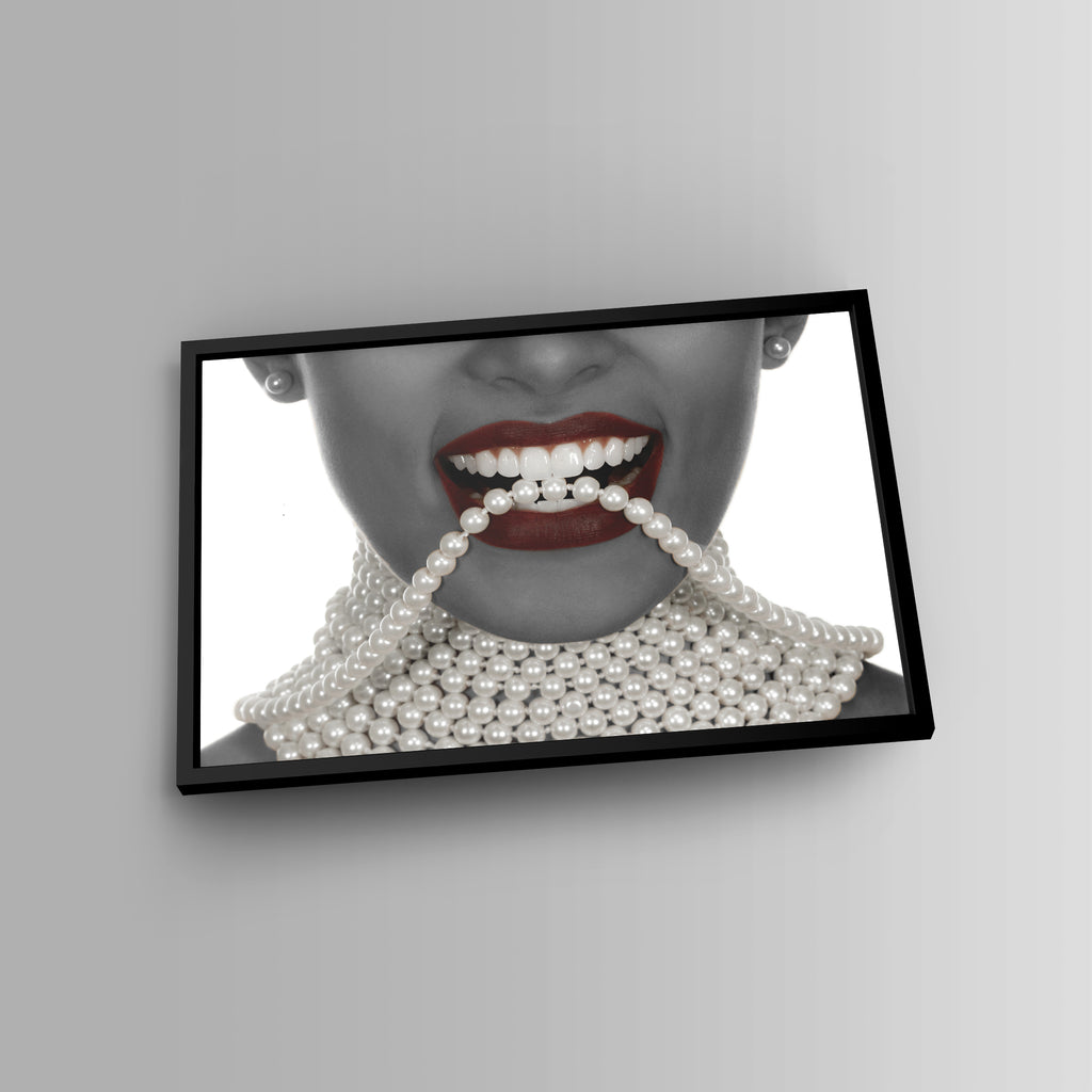 A comparação dos dentes perfeitos com um colar de pérolas é a inspiração para essa belíssima imagem que confere sofisticação e elegância a qualquer ambiente... Além de inspirar o desejo de todo cliente a querer um sorriso tão belo quanto o da modelo! E a nova versão com pele reservada em preto e branco confere ainda mais elegância a essas imagens, campeãs de vendas do site!